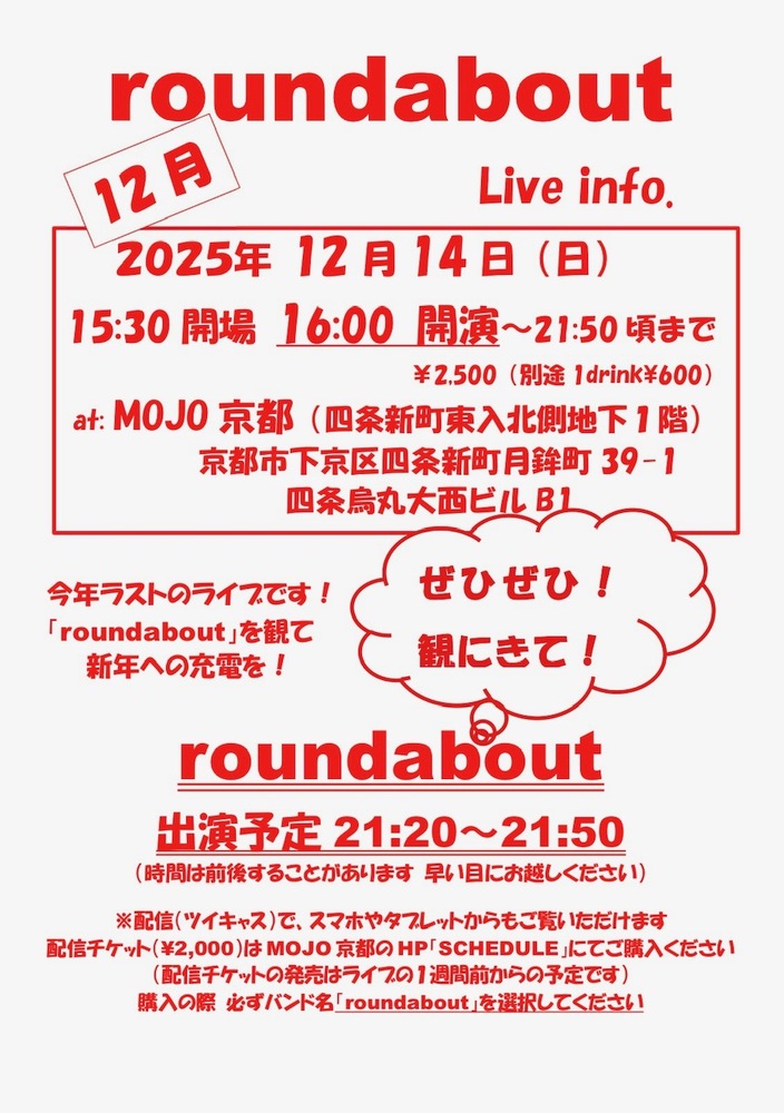 昨日(12/14)は[MOJO京都]にて「roundabout」の今年ラストのライブでした